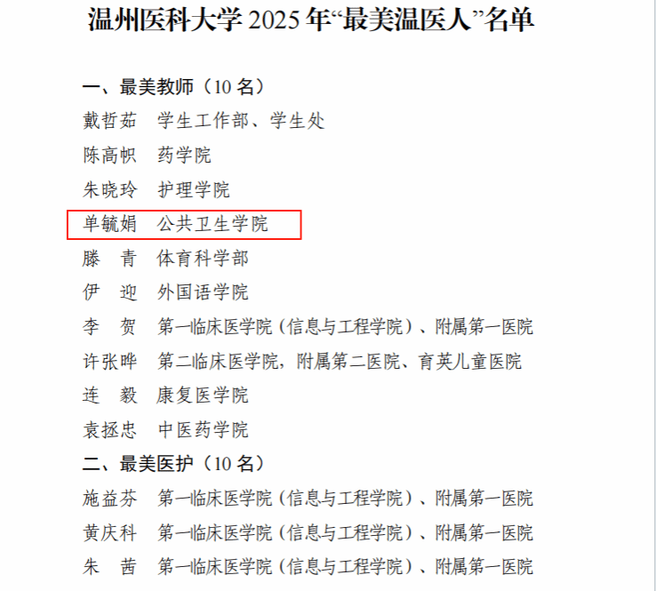 近日,一品探花 2025年“最美温医人”评选结果正式公布,学院教师单毓娟获此殊荣。