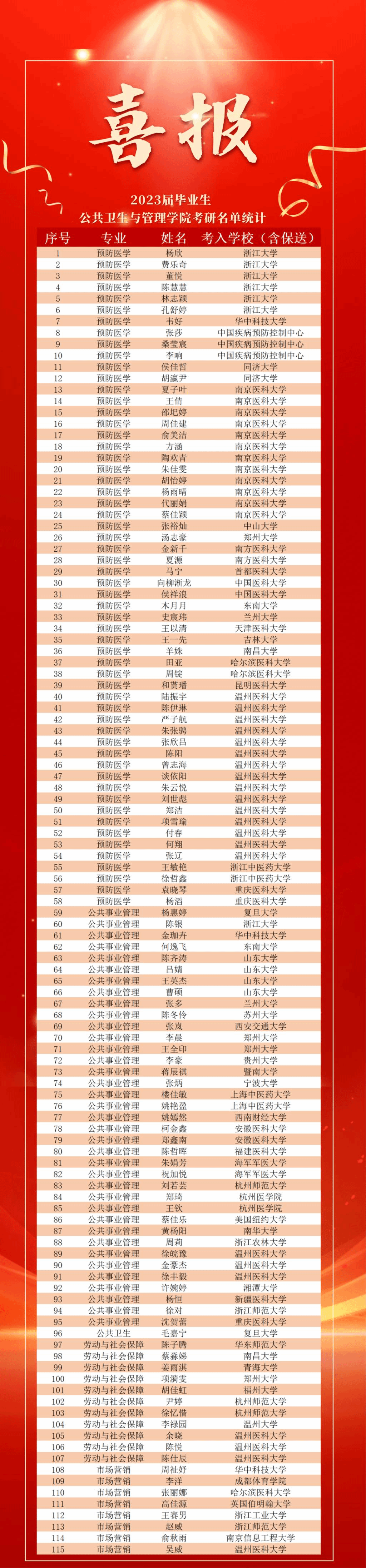 2023年,公共卫生与管理学院考研成绩再创新高,一大批优秀学子在今年的考研大军中脱颖而出,斩获佳绩。我院115位本科生相继被中国疾病预防控制中心、华中科技大学、复旦大学、浙江大学、同济大学、首都医科大学等知名高校拟录取为研究生。精诚所加,金石为开,祝贺他们取得了喜人的成绩!学院特向广大师生报喜,希望拟录取的同学踔厉奋发,笃行不怠,也希望更多卫管学子继续坚定信心、不畏困难,勇创新的佳绩!