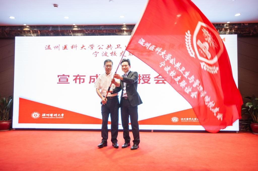 公共卫生与管理学院书记马洪君宣布公共卫生与管理学院校友会宁波校友联谊会正式成立,并为联谊会会长沈钱授旗。现场嘉宾为联谊会会长、副会长、秘书长、理事们颁发聘书。