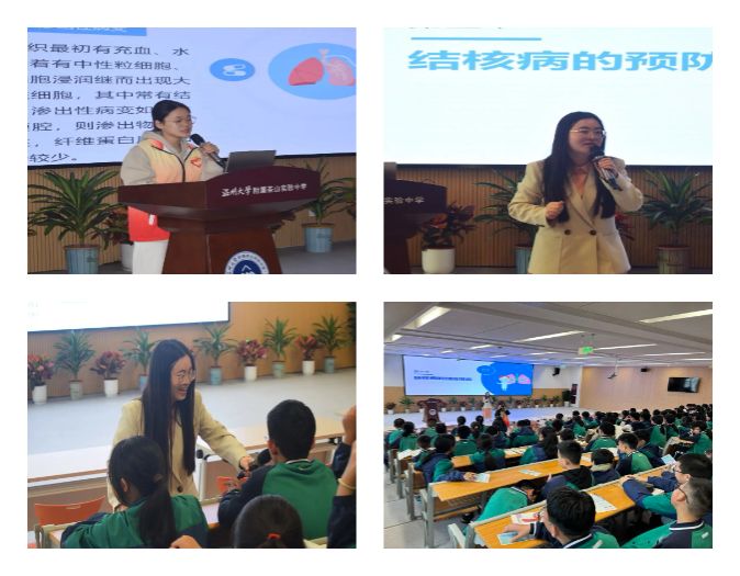 以第29个世界防治结核病日为契机,学院石芳老师和章红静同学为茶山实验中学近二百名师生做“预防肺结核科普知识”健康讲座,详细讲解结核病的基本知识、发病机制、治疗方法,普及疫苗接种的重要性,提高师生对结核病的认知和重视。此外,一品探花 各支部代表向在场的师生发放了健康宣讲手册,科普肺结核的相关知识。